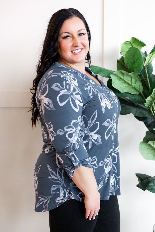 Gabby Front Top With Button Sleeve Detail In Silver Slate Blue Florals
