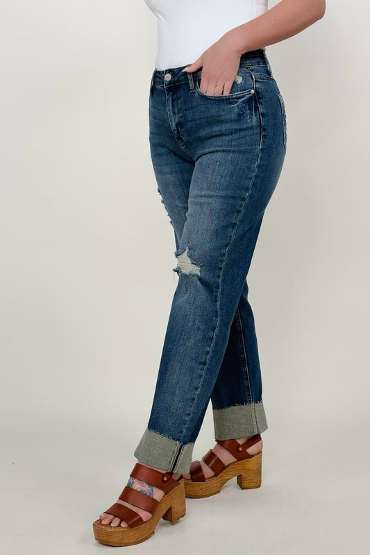 Judy Blue Mid-Rise Destroy & Single Cuff Dad Jean Straight Jeans