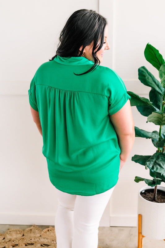 Silky Button Front Blouse In Emerald Green